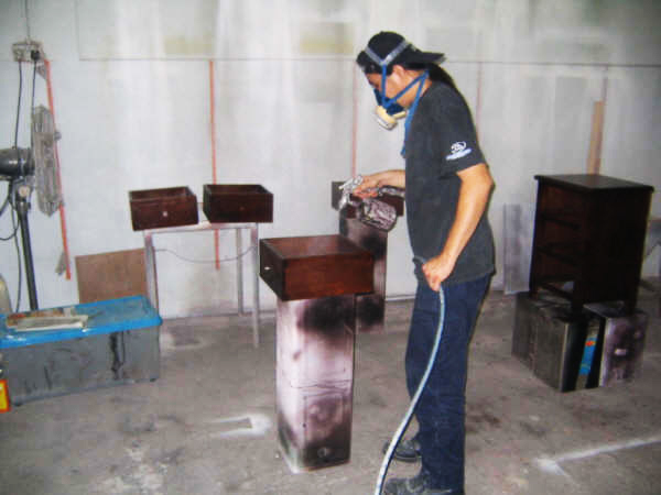 Drawers are removed from side table in which every side interior will be sprayed on perfectly.